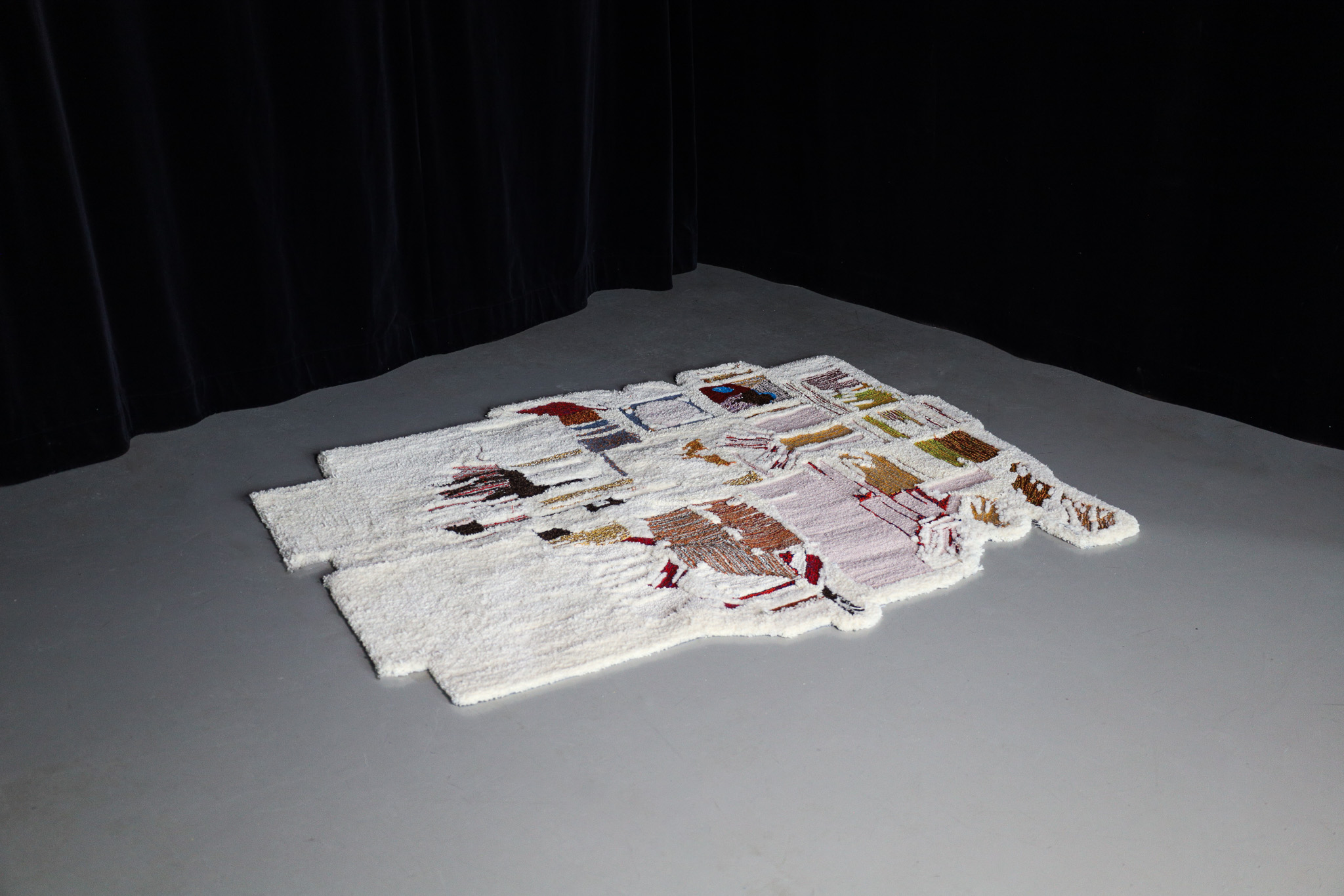 The project began with a used tufting canvas from a workshop—an unexpected artwork created by multiple people practicing their skills without coordination. Usually discarded, this layered, anonymous piece revealed a unique story worth exploring and completing.